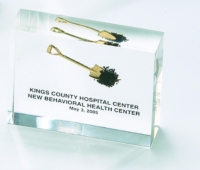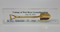 Surface printed acrylic paperweight shovel awards—perfect for commemorating groundbreaking events. Hundreds of stock shapes and sizes. Customizable with your logo, text, building photo or event date. A unique keepsake for construction milestones, corporate groundbreaking celebrations, real estate development projects, and grand openings.