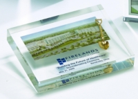 Surface printed acrylic paperweight awards—perfect for commemorating groundbreaking events. Hundreds of stock shapes and sizes. Customizable with your logo, text, building photo or event date. A unique keepsake for construction milestones, corporate groundbreaking celebrations, real estate development projects, and grand openings.